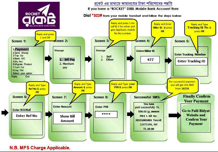 সংযোগের অর্থ ডাচবাংলা ব্যাংকের মোবাইল ব্যাংকিং (রকেট) এর মাধ্যমে পরিশোধ করা যাবে।